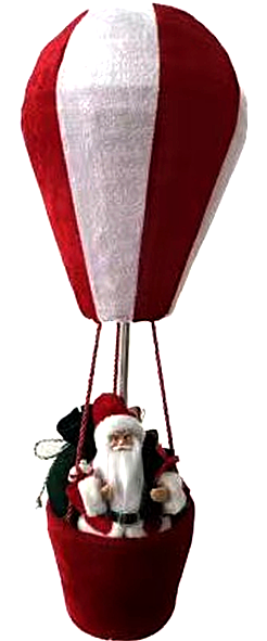 Χριστουγεννιάτικο διακοσμητικό με τον Άγιο Βασίλη σε αερόστατο, φτιαγμένο σε κλασικά κόκκινα και λευκά χρώματα. Ο Άγιος Βασίλης βρίσκεται μέσα στο καλάθι του αερόστατου, κρατώντας έναν σάκο με δώρα, έτοιμος να διανείμει χαρά. Το αερόστατο είναι διακοσμημένο με ύφασμα σε κόκκινο και λευκό, προσδίδοντας μια παιχνιδιάρικη και γιορτινή αίσθηση στη διακόσμηση. Ιδανικό για όσους θέλουν μια πρωτότυπη και χαρούμενη πινελιά στις γιορτές.