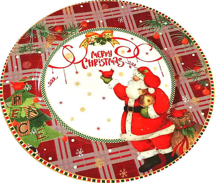 Αυτή η χριστουγεννιάτικη πιατέλα διαμέτρου 23 εκατοστών είναι διακοσμημένη με χαρούμενο σχέδιο του Άγιου Βασίλη και το μήνυμα "Merry Christmas". Το κόκκινο καρό φόντο και οι λεπτομέρειες από γιορτινά στολίδια, κλαδιά και πουλάκια την καθιστούν ιδανική για να σερβίρετε χριστουγεννιάτικα γλυκίσματα ή φρούτα, ενώ προσθέτει μια γιορτινή νότα στο τραπέζι σας. Κατάλληλη για να δώσει χρώμα και χαρά στις γιορτές σας.