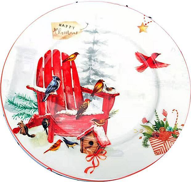 Αυτή η μοναδική χριστουγεννιάτικη πιατέλα διαθέτει ένα ρομαντικό σχέδιο με κόκκινη ξύλινη καρέκλα, περιτριγυρισμένη από πολύχρωμα πουλιά σε ένα χειμωνιάτικο τοπίο. Το σχέδιο περιλαμβάνει μικρές γιορτινές λεπτομέρειες, όπως το χριστουγεννιάτικο δώρο και το μήνυμα "Happy Christmas". Ιδανική για να σερβίρετε γλυκά ή να στολίσετε το γιορτινό σας τραπέζι, αυτή η πιατέλα προσφέρει μια φιλική και ζεστή νότα στη χριστουγεννιάτικη διακόσμηση σας.