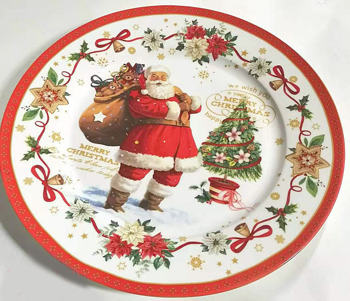 Πιατέλα χριστουγεννιάτικη διαμέτρου 23εκ. με χαρούμενη απεικόνιση του Άγιου Βασίλη και στολισμένου δέντρου, διακοσμημένη με λουλούδια, κορδέλες και αστέρια περιμετρικά. Ιδανική για να διακοσμήσει το γιορτινό σας τραπέζι ή να παρουσιάσει χριστουγεννιάτικα κεράσματα με στυλ και γιορτινή διάθεση.